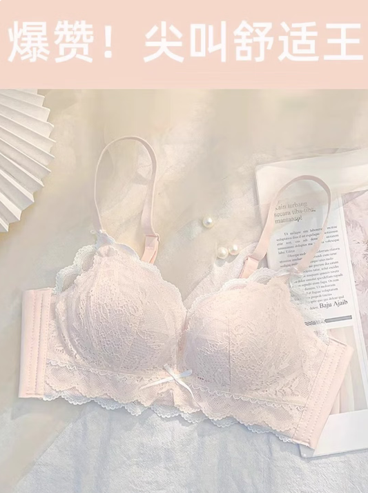 KJ蕾丝内衣女小胸聚拢收副乳胸罩bra大胸防下垂薄款少女文胸夏季 浅粉色单文胸